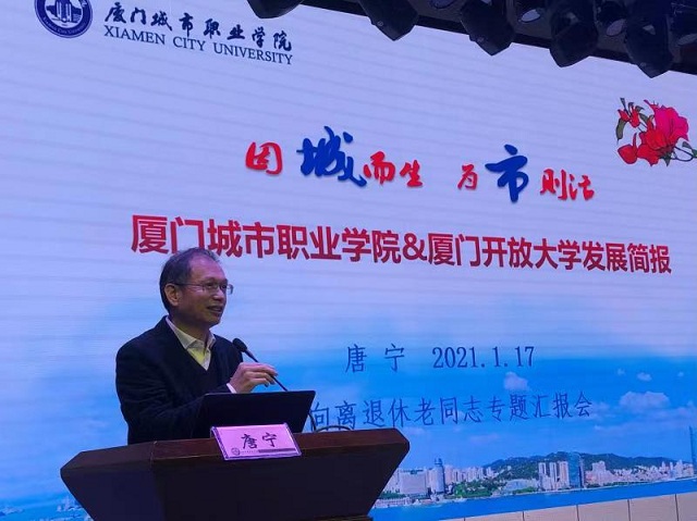 会上,校长唐宁代表学校领导班子及全体在岗教职工向全体离退休教师表示衷心的感谢,并对他们致以诚挚的新春祝福,并作《因城而生 为市则活——厦门城市职业学院&厦门开放大学发展简报》的主题报告。他从校园新变化、办学新探索、规划新思考三个方面,用具体生动的案例和翔实的数据,汇报了学校“产教融合共同发展、大爱匠心协同育人”更加鲜明的办学特色和取得的入选福建省示范性现代高等职业院校等历史性成果。