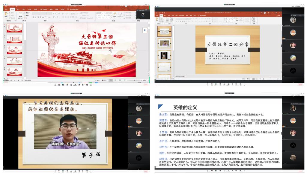 会上,培训班第一组组长刘彬彬首先带领大家重温了在“加勒万河谷冲突”中负伤的祁发宝和牺牲的陈红军、陈祥榕、肖思远、王焯冉4位烈士的英雄事迹。随后,从卫国戍边英雄们的爱国主义精神出发,分享了组员们结合成长经历、专业学习、校园生活和学生工作等方面的学习体会和内心感触。来自第二组的陈弘哲做了以“向英雄致敬,立报国之志”为主题的发言,动情的言语让学员们明白:岁月静好,只因有人负重前行;山河无恙,只因英雄铁肩担当。第三组学员代表陈婷向大家讲述了肖思远和优秀校友盖军衔的英雄事迹,号召大家致敬职业院校英雄模范,成为具有爱国情、强国志、报国心的中国特色社会主义建设者和接班人。第四组和第五组学员们均通过视频录制的形式,围绕肖思远等戍边英雄以及其他英雄模范人物的事迹,谈思想体会、谈学习感悟,深入学习他们敢打敢拼、舍生取义的英雄气概和不畏艰险、勇于挑战的革命精神。