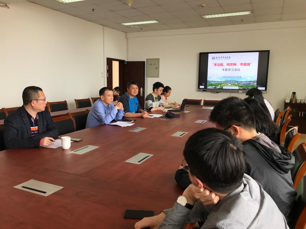 为积极推进依法治教、依法办学、依法治校工作,提高教职工的法律意识和法律素质,将法制教育与实践相结合,营造良好的法治环境,3月24-31日,机械系开展了“学法规、鸣警钟、守底线”专题学习活动。