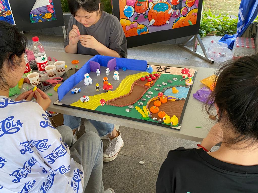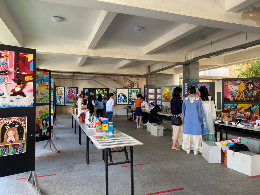 5月26日下午,随着学校2021年职业教育活动周的启动,以“技能:让生活更美好”为主题的教育与民生学院学前教育专业学生绘画作品与手工作品展暨学生现场即兴创作在五区广场精彩亮相。