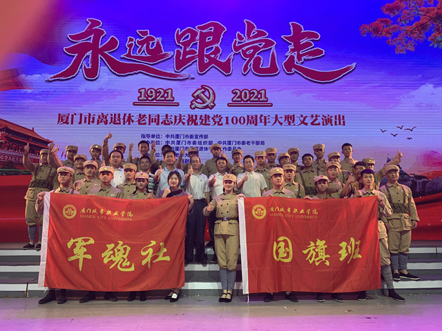 6月20日下午,我校军魂社、国旗班同学在厦门歌舞剧院参加了由中共厦门市委组织部、市委老干部局等主办的离退休老同志庆祝中国共产党成立100周年大型文艺演出。省委常委、厦门市委书记赵龙等四套班子领导,在厦的省市级老领导,校党委书记蒋先立,党委委员、副校长林春才,党委副书记王育培,团委书记黄超,继续教育中心主任黄文龙,通识教育学院院长李文刚以及部分教师出席活动。