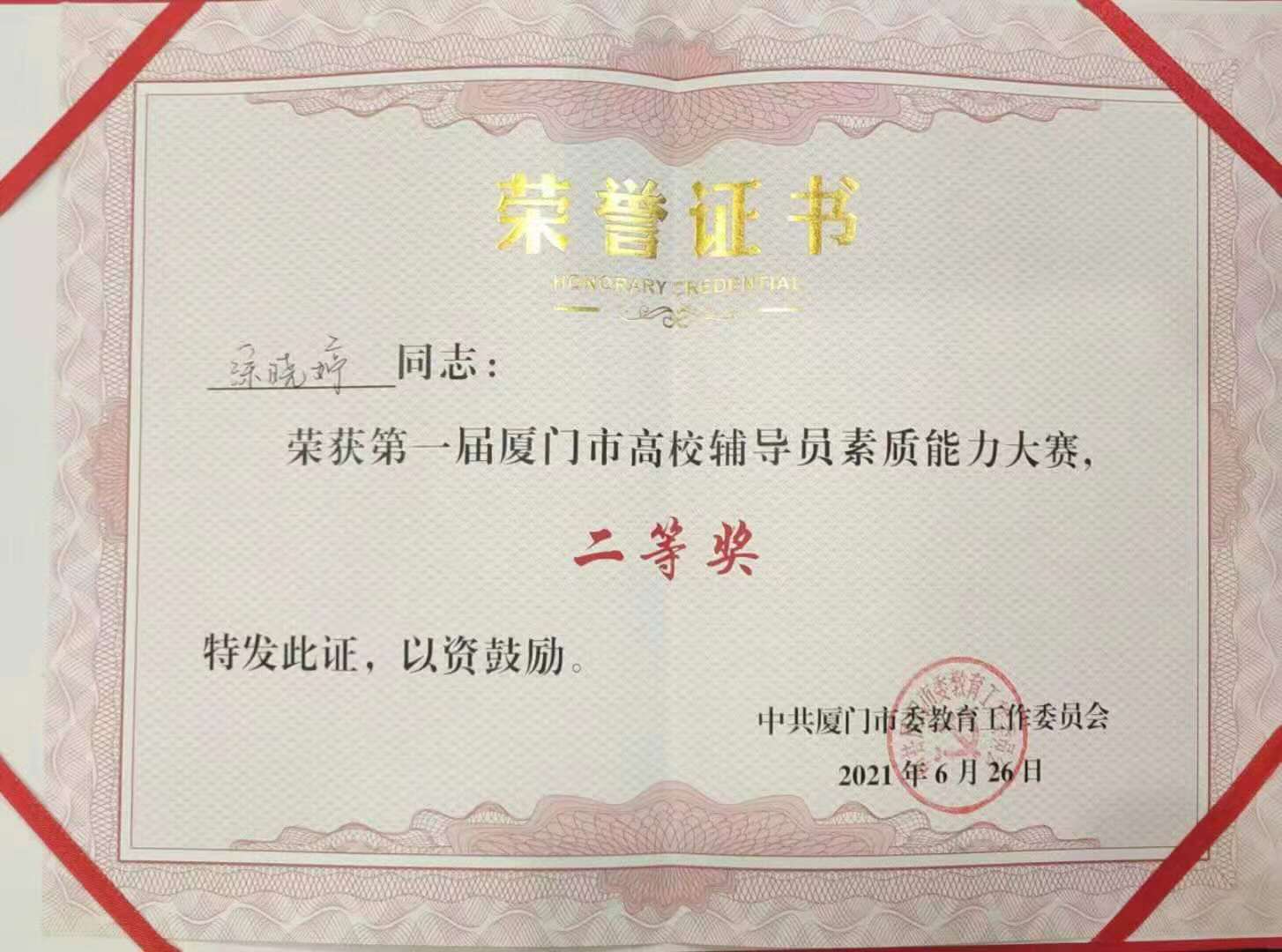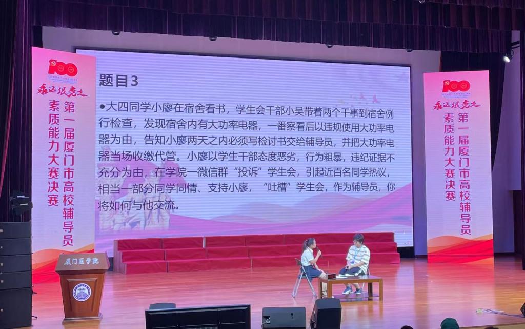 6月26日,由中共厦门市委教育工作委员会主办,厦门市高校辅导员协会承办的厦门市首届高校辅导员素质能力大赛决赛在厦门医学院成功举办。来自全市18所本科、高职院校的18名辅导员同台竞技、各展风采。经过激烈角逐,我校机械与自动化工程系辅导员涂晓婷老师名列第四名,斩获二等奖,系全市高职院校最好成绩。