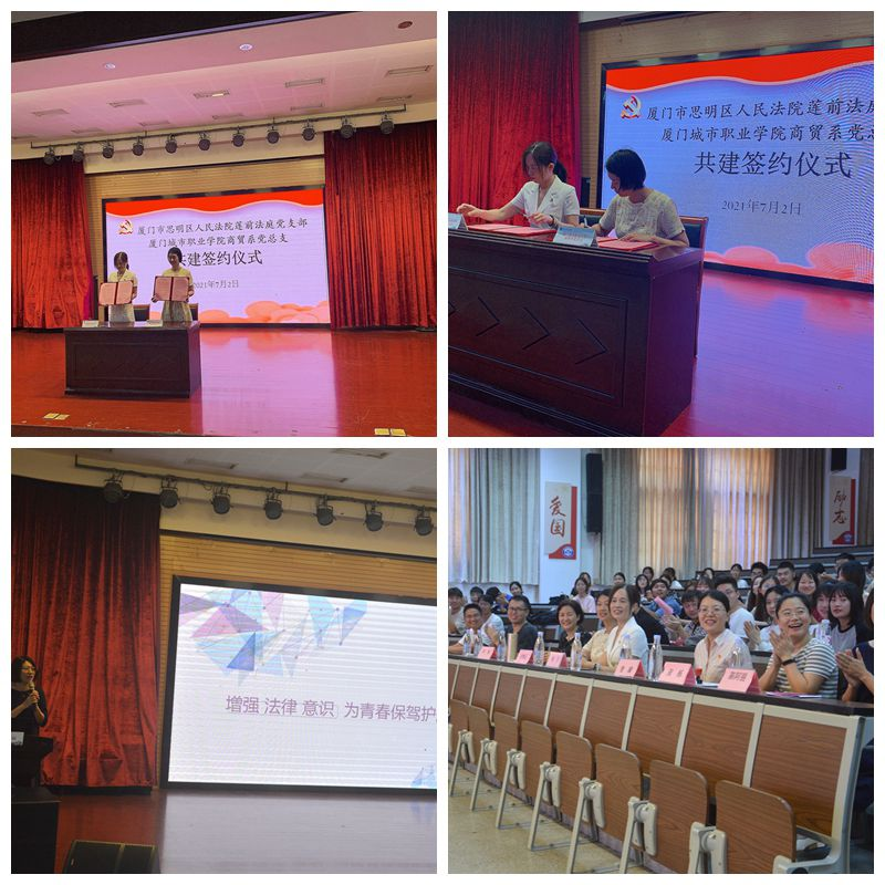 为进一步加强党建工作,营造良好的“学法、懂法、用法”的法治氛围。7月2日下午,商贸系党总支与思明区人民法院莲前法庭党支部在明德楼4-101学生活动中心开展共建活动。商贸系党总支副书记宋凌云与思明区人民法院莲前党支部书记林芳签订了协议。