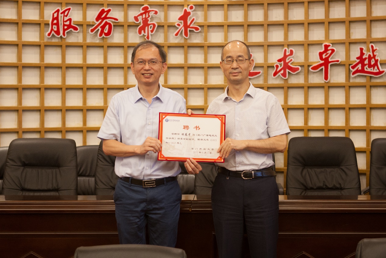 唐宁校长为新任编委会副主任林春才副校长颁发聘书