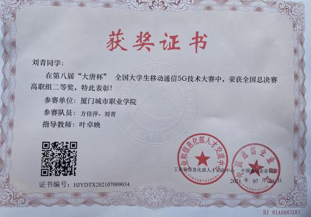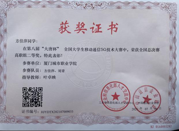 6月24日至27日,第八届“大唐杯”全国大学生5G技术大赛全国总决赛在北方工业大学举行。我校首次派队参加该项赛事,参赛队伍由通信技术专业师生( 学生方佳萍、刘青,指导教师叶卓映)组成,荣获高职组二等奖。