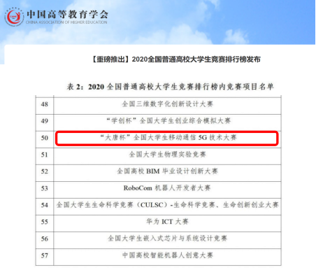 据悉,2021年3月22日,中国高等教育学会高校竞赛评估与管理体系研究工作组发布2020全国普通高校大学生竞赛排行榜,其中包含高职院校榜单10个。57项竞赛被列入排行榜竞赛项目名单,“大唐杯”全国大学生移动通信5G技术大赛首次被列入名单,成为影响高校全国排名的重要赛事之一。