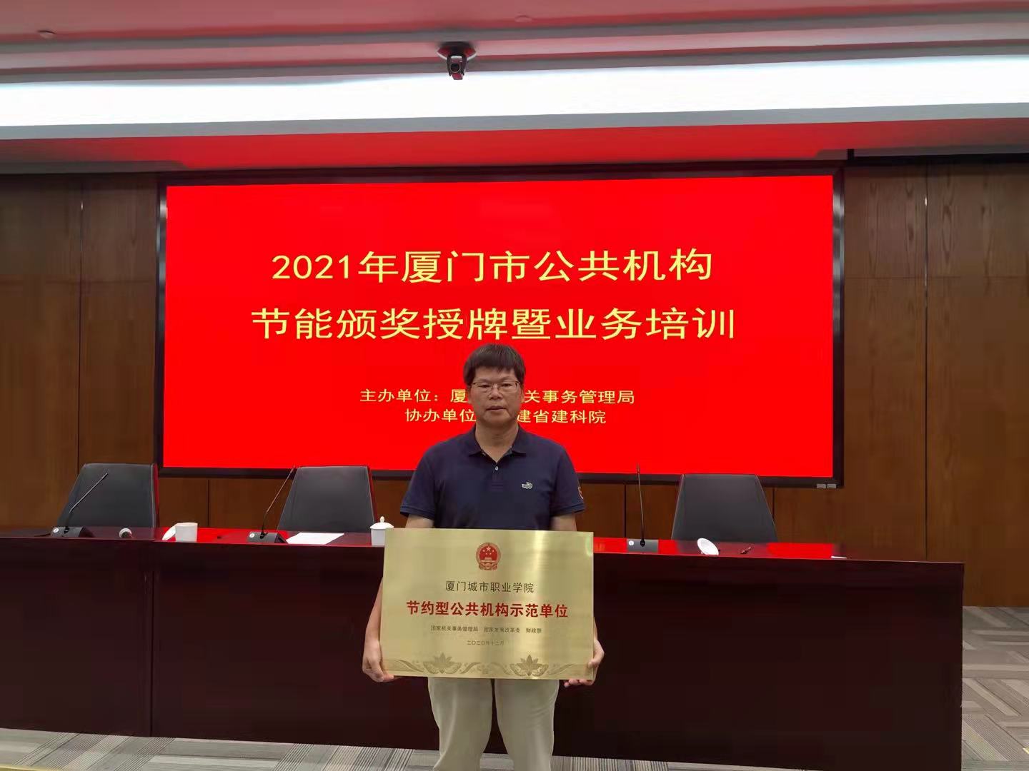 作为节能宣传周系列活动之一,厦门市机关事务管理局于8月24日上午组织市直单位、各区公共机构节能管理人员在领事馆区参加厦门市公共机构节能工作授牌仪式。会上,学校后勤管理处林水併处长接受国家机关事务局、国家发展改革委、财政部评选的“国家级节约型公共机构示范单位”授牌,用于表彰学校在能源资源节约集约利用和节约型绿色低碳公共机构建设上的卓有成效。
