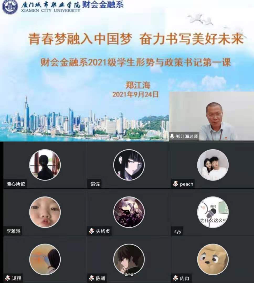为贯彻落实学校党委《关于做好学习贯彻习近平总书记在庆祝中国共产党成立100周年大会上重要讲话精神专题宣讲工作的方案》要求,财金系党总支结合新生入学教育,组织开展“青春梦融入中国梦 奋力书写美好未来”为主题的线上宣讲活动。