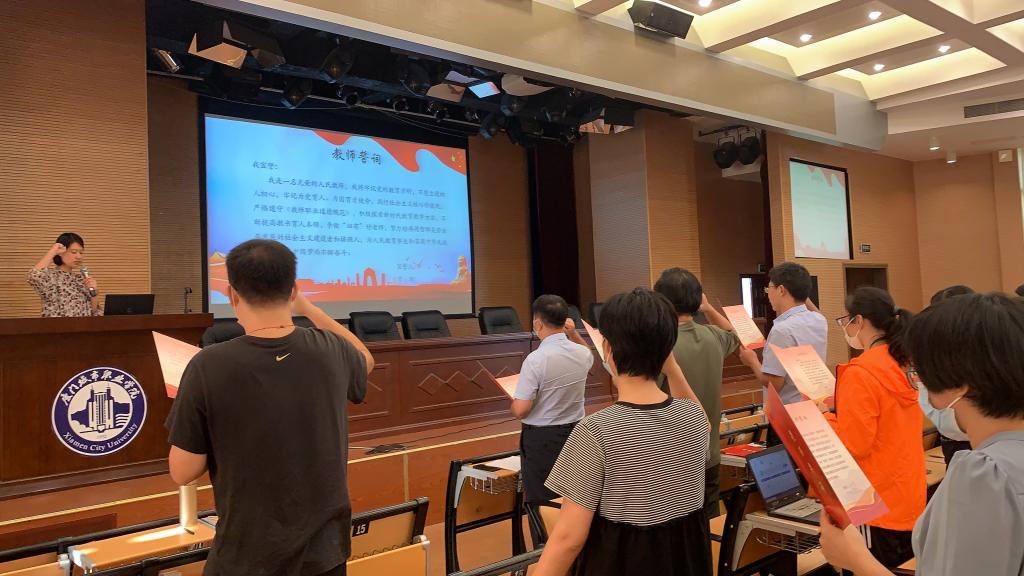 在学习《习近平给全国高校黄大年式教师团队代表的回信》及《教师誓词(2021版)》后,商贸系党总支全体教职工带着人民教师的职责与使命,全体起立,举起右手,庄严宣誓。随着教师誓词一字字有力的吐出,各位教师进一步坚定了立德树人初心,牢记为党育人、为国育才使命,决心严格遵守《教师职业道德规范》,努力立德修身、潜心治学、开拓创新,成为学生为学、为事、为人的示范,成为促进学生成长为全面发展的人。