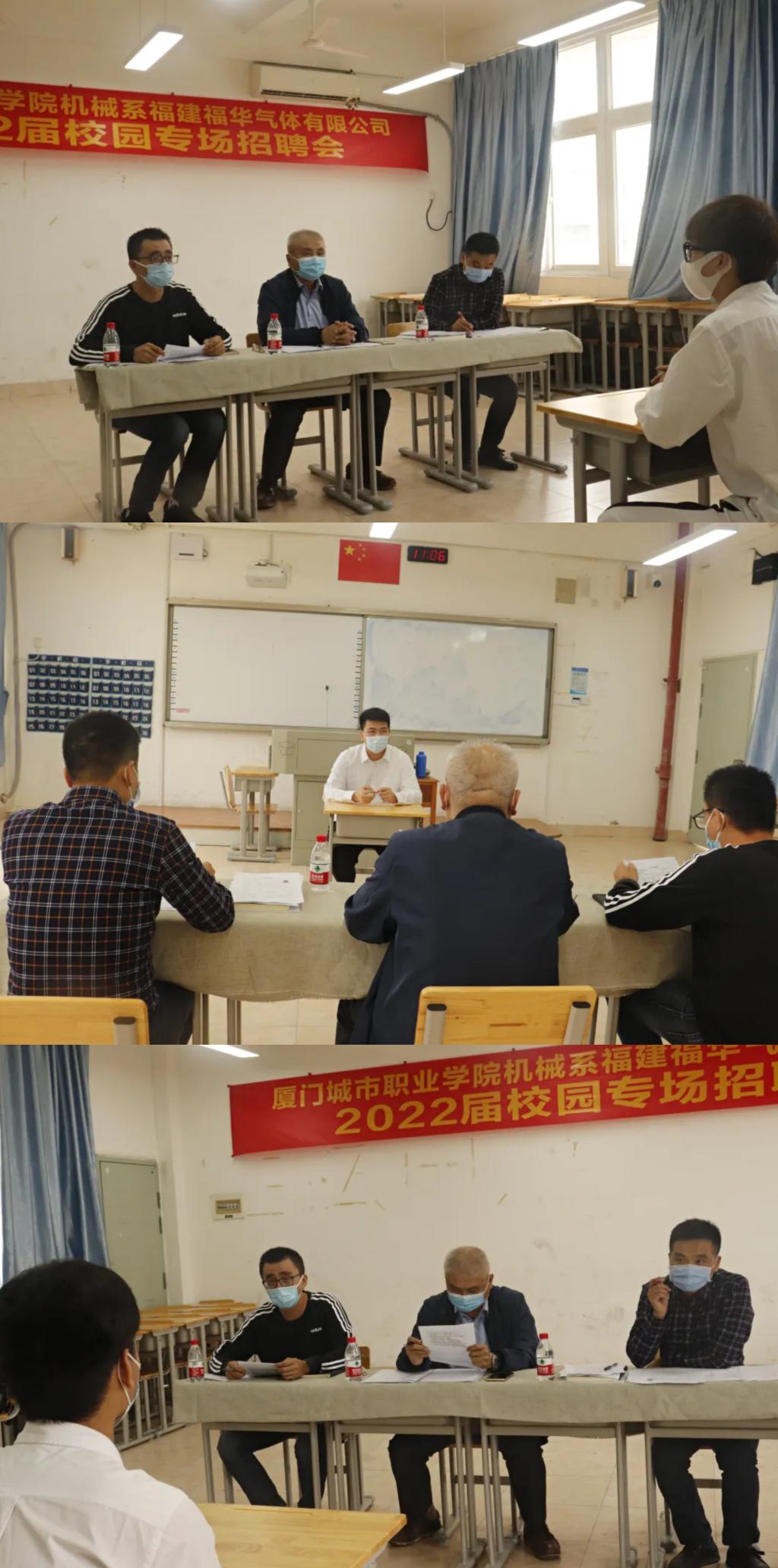 10月29日上午,厦门城市职业学院机械系福建福华气体有限公司2022届校园专场招聘会在明德楼3-403举行,系部就业负责人及现场工作人员高度重视,认真筹划,精心组织。共有8名同学从简历筛选中脱颖而出进入面试环节,福华气体有限公司副总经理王信盛、生产部经理尹文辉、运行主管王敏生亲临现场担任面试官,面试现场严肃、规范、有序,同学们的表现获得面试官的青睐和好评。