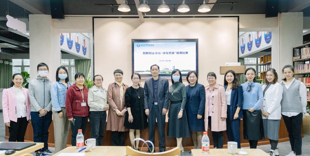2021年11月17日下午,创新创业学院举办“课程思政”说课比赛。吴松青副校长、教务处戴力芳处长现场指导。马克思主义学院闫睿颖、覃燕,财金系刘郁葱、于巧玲,数媒学院苏晓梅5位老师担任评委。