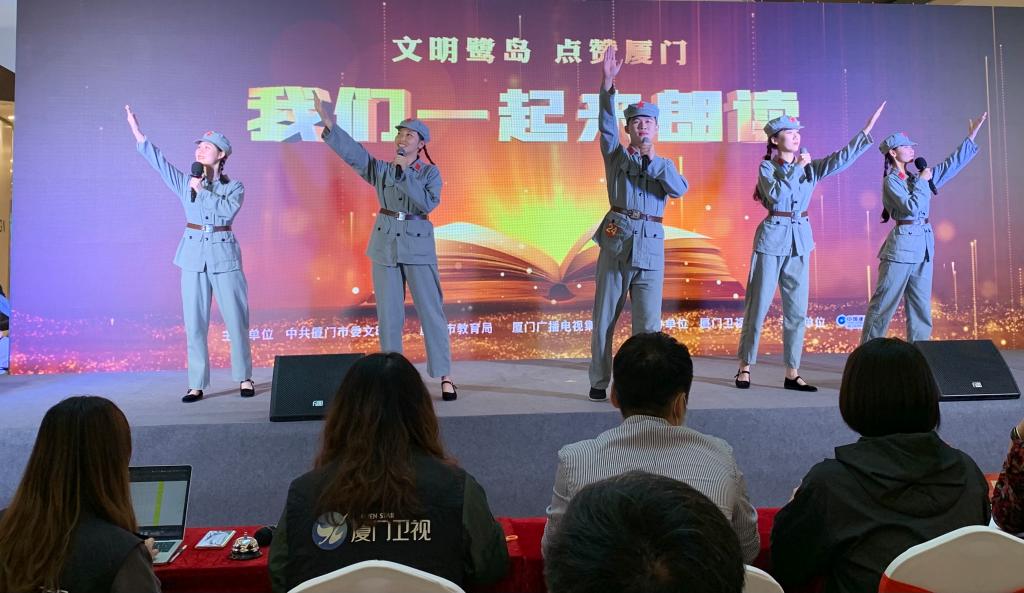 在由厦门市委文明办、厦门市教育局和厦门市广播电视集团联合主办的“文明鹭岛、点赞厦门”我们一起来朗读第五季经典诵读比赛中,我校陈倚璐、张行、黄建朝、程梓桦、刘弋戈等五位同学朗诵表演的《毛主席长征诗词联诵》(指导老师李文刚、于巧玲),在众多参赛者中脱颖而出进入总决赛,获得优秀节目奖,参赛作品在厦门电视台播出。