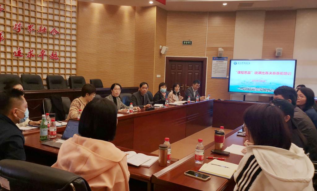教务处张颖颖副处长对本次比赛的政策背景、具体安排、注意事项作了详细说明。马克思主义学院吴细玲教授从专业角度讲解了课程思政目的及各学科有效融入课程思政元素的方法。国家级“课程思政”教学名师、商贸系赖玲玲老师向参赛教师分享了其比赛经验,分析了课程思政说课设计并就片段教学给予了针对性指导。教务处戴力芳处长鼓励参赛教师积极备赛,争取以最好的状态展示我校教师的风采。