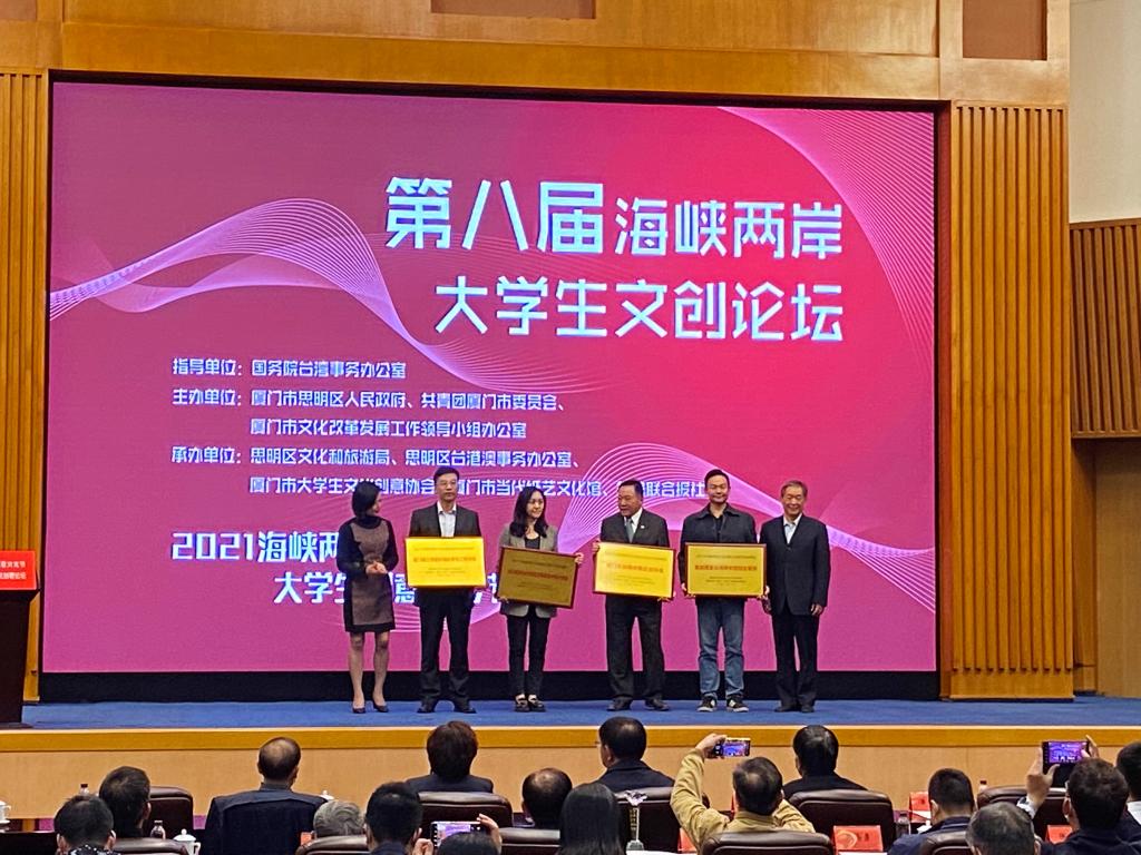 由国务院台湾事务办公室指导,厦门市思明区人民政府、共青团厦门市委员会、厦门市文化发展改革领导小组办公室共同主办,思明区文化和旅游局、思明区台港澳事务办公室、厦门市大学生文化创意协会联合承办的“第八届海峡两岸大学生文创论坛”于12月05日上午在厦门会展中心国际会议厅隆重举行,现场近六十余位两岸嘉宾代表、超三百位来自台湾艺术大学、厦门城市职业学院、厦门理工学院、华侨大学等两岸学生代表出席活动。我校数字媒体艺术设计学院荣获“2021年海峡两岸文化创意交流合作优秀单位”奖项。