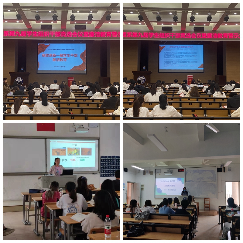 11月26日,以“不忘初心讲奉献,勇于担当有作为,廉洁自律做表率”为主题的商贸系新一届学生会干部廉洁教育活动在会议一举行。主题教育活动从恪守学生本分、牢记学生干部宗旨、永葆理想主义情怀、扎扎实实做事、营造平等氛围、摒弃庸俗习气等几方面教导学生干部克服精致利己思想,做到廉洁自律并签订商贸系学生干部廉洁自律公约。
