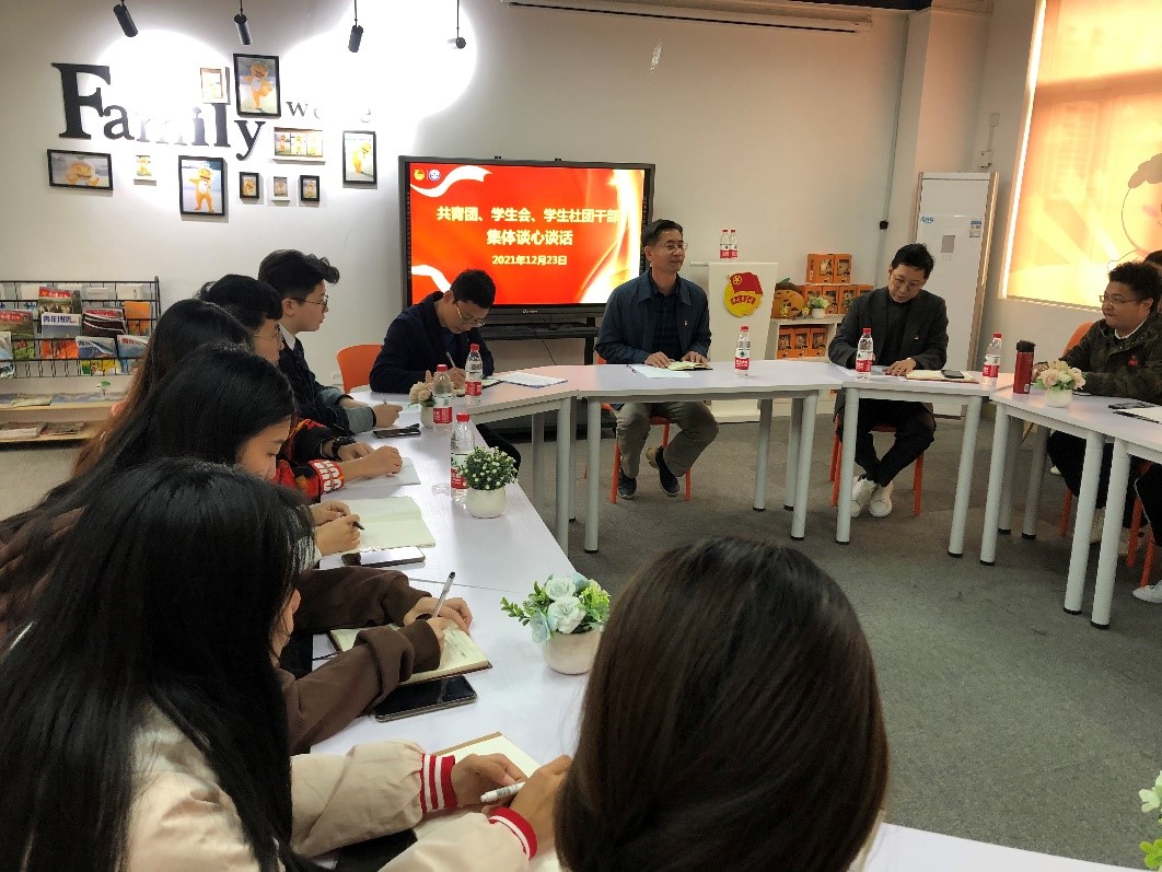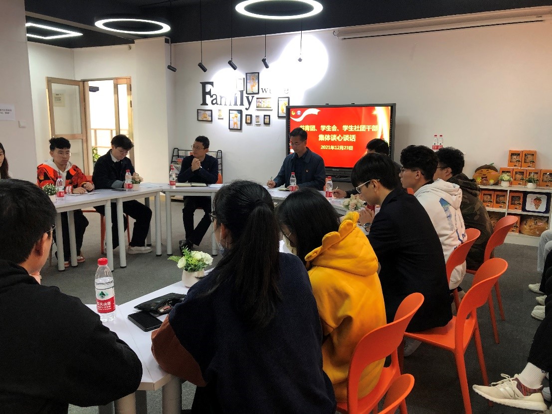 为加强学校党委对团学工作的领导,优化学生干部队伍建设,促进学生工作规范提升。我校于2021年12月25日召开了“做新时代品学兼优学生干部”座谈会。校党委副书记王育培、校团委负责人和来自校学生会、各二级学院、社团的24名学生干部代表参加了此次座谈会。