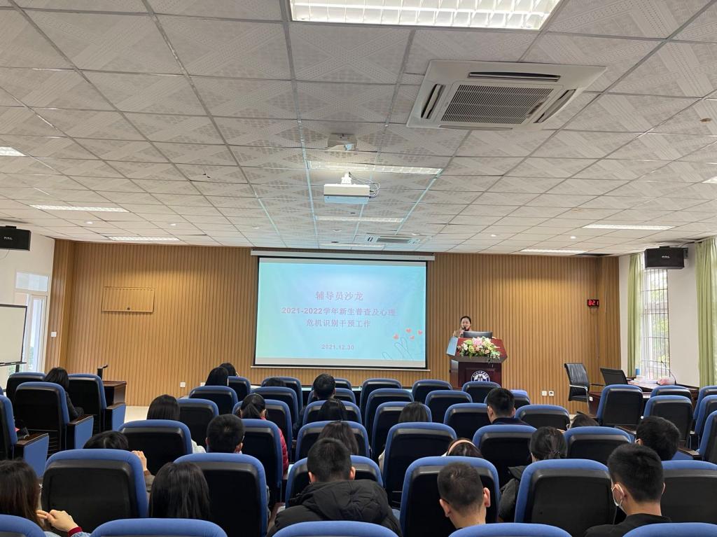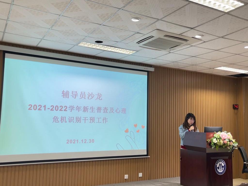为提升我校辅导员心理危机干预技能,熟悉危机干预流程,明确危机干预工作边界,科学、有效应对校园心理危机突发事件,12月30日下午,学生工作处举办2021-2022学年新生普查及危机识别干预辅导员沙龙活动。心理中心朱银燕老师担任本次主讲,学生工作处负责人、各院系总支书记以及全体辅导员参与此次沙龙活动。