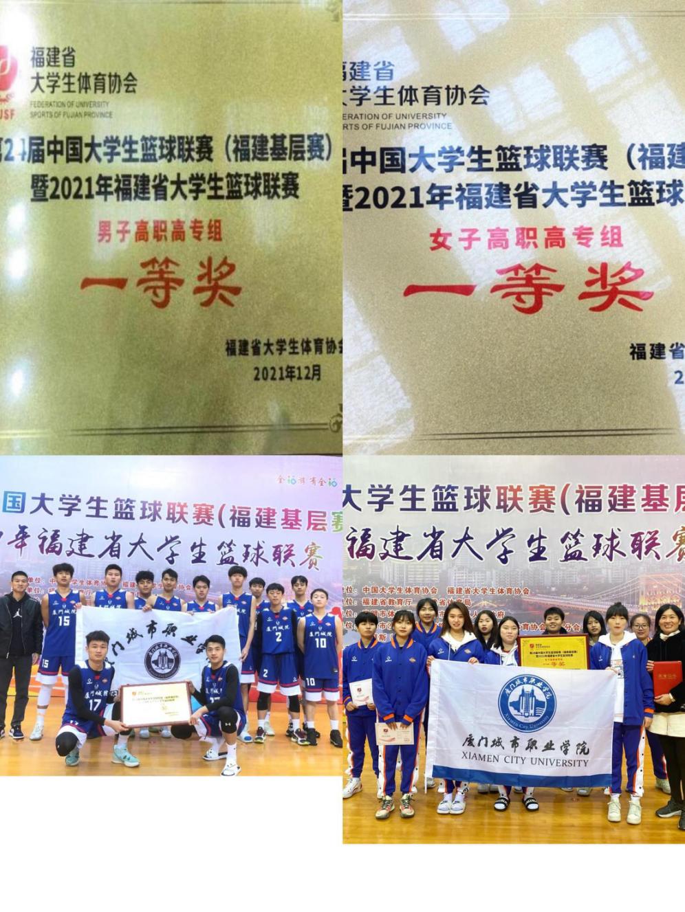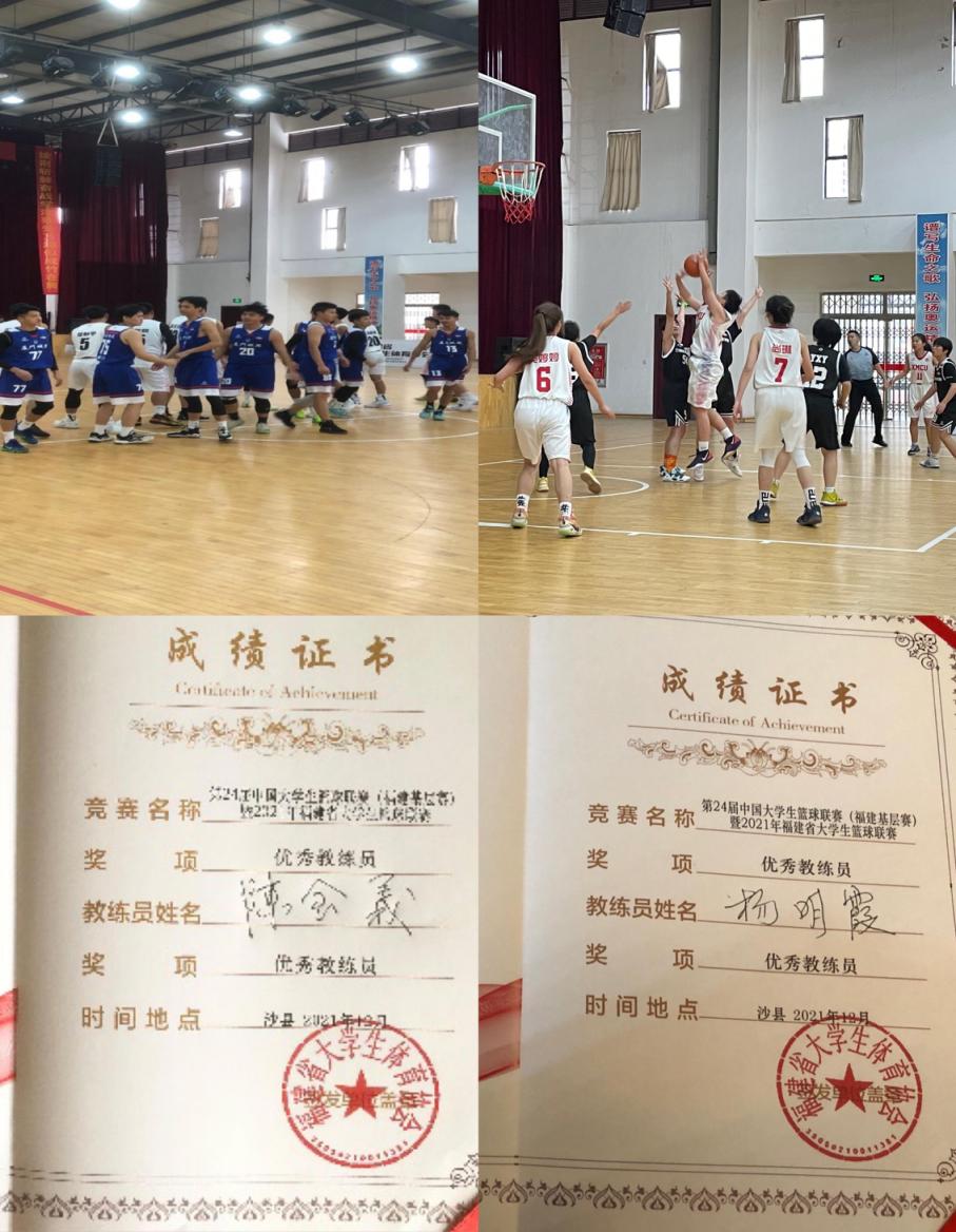 第24届CUBA中国大学生篮球联赛(福建基层赛)暨2021年福建省大学生篮球联赛于12月21日至12月28日在三明沙县举行。经过激烈角逐,我校男队以22战21胜的成绩获得男子高职高专组一等奖、女队以15战14胜获得女子高职高专组一等奖。男篮教练陈金义老师、女篮教练杨明霞老师分别荣获“优秀教练员”荣誉称号。