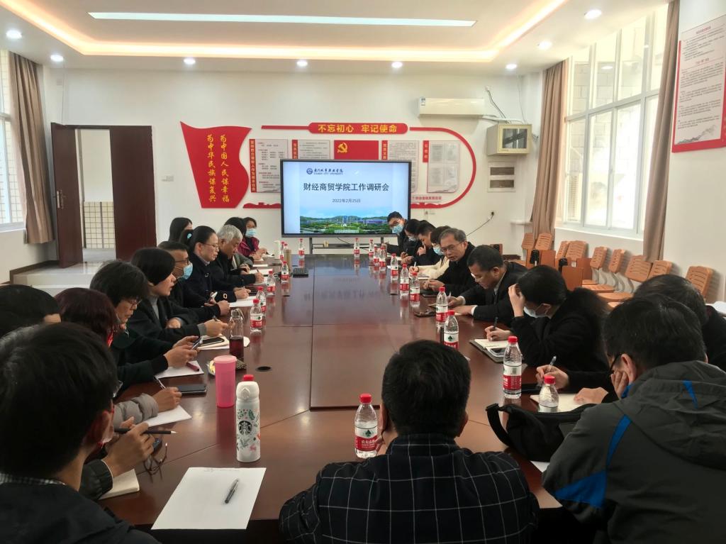 2月25日下午,学校党委书记蒋先立、校长唐宁与党政办、教务处、人事处、财务处、质量保障办等职能部门负责人一行到财经商贸学院调研。财经商贸学院党政负责人、各专业主任、教师代表参加调研会议。