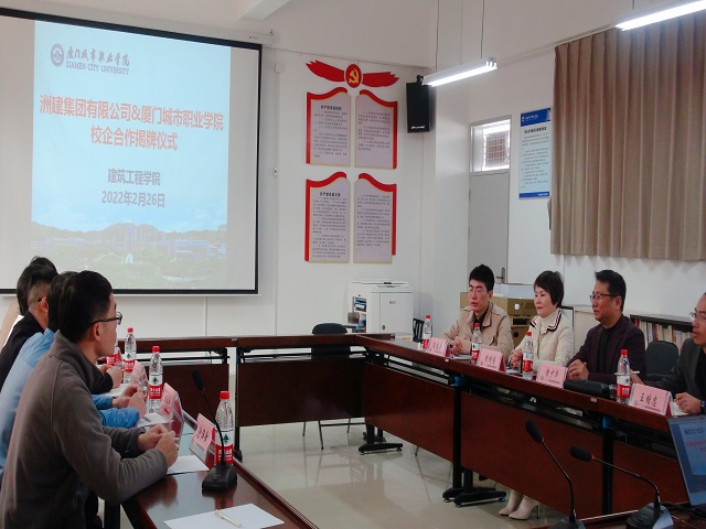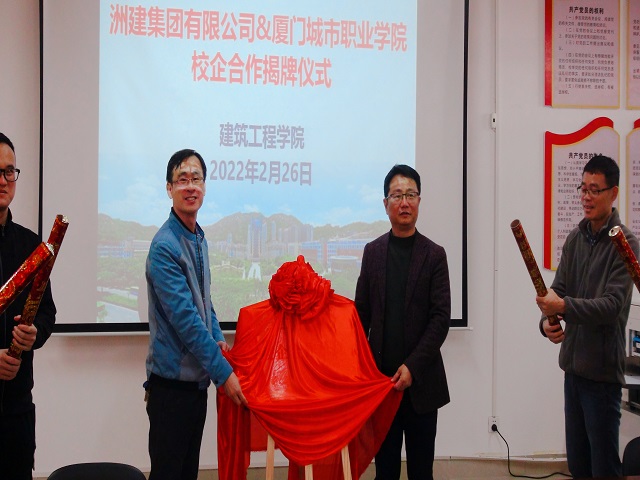 近日,建筑工程学院与洲建集团有限公司(以下简称“洲建”)在笃行楼会议室举行了简单而隆重的校企合作单位揭牌仪式。建筑工程学院负责人、建筑装饰工程技术专业相关教师,洲建总裁黄少华、副总裁黄明芬、精装科技副总经理王培忠、乐家物联科技首席运营官陈志芳等多位企业代表和专家参加了此次活动。