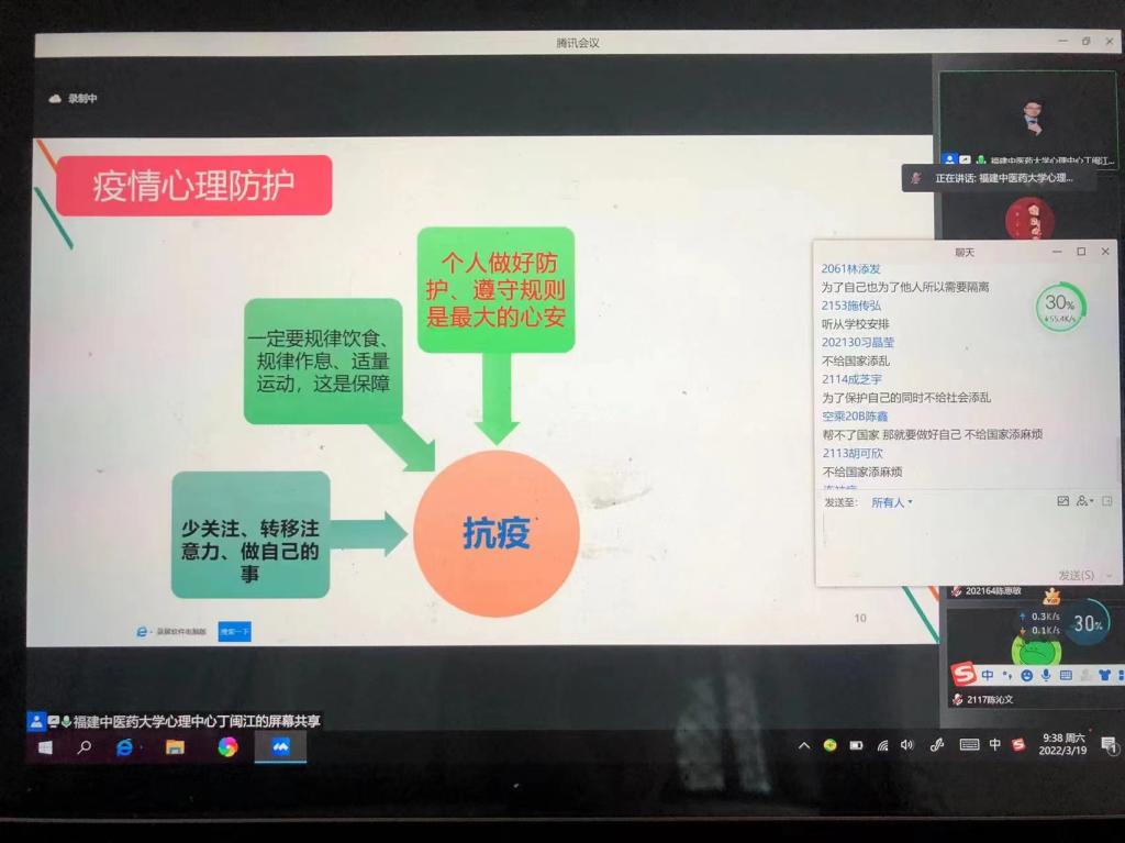 3月19日上午,我校大学生心理健康教育与咨询中心邀请教育部普通高等学校学生心理健康教育专家指导委员会委员、全国高校心理健康教育“优秀青年工作者”荣誉称号获得者、福建中医药大学大学生心理健康教育指导中心主任丁闽江副教授,为师生作专题讲座《疫情与心理健康》。此次讲座通过线上平台举办,在校居家健康监测、居家隔离的学生与咨询中心专兼职教师、辅导员、2021级学生心理委员及部分学生代表参加。