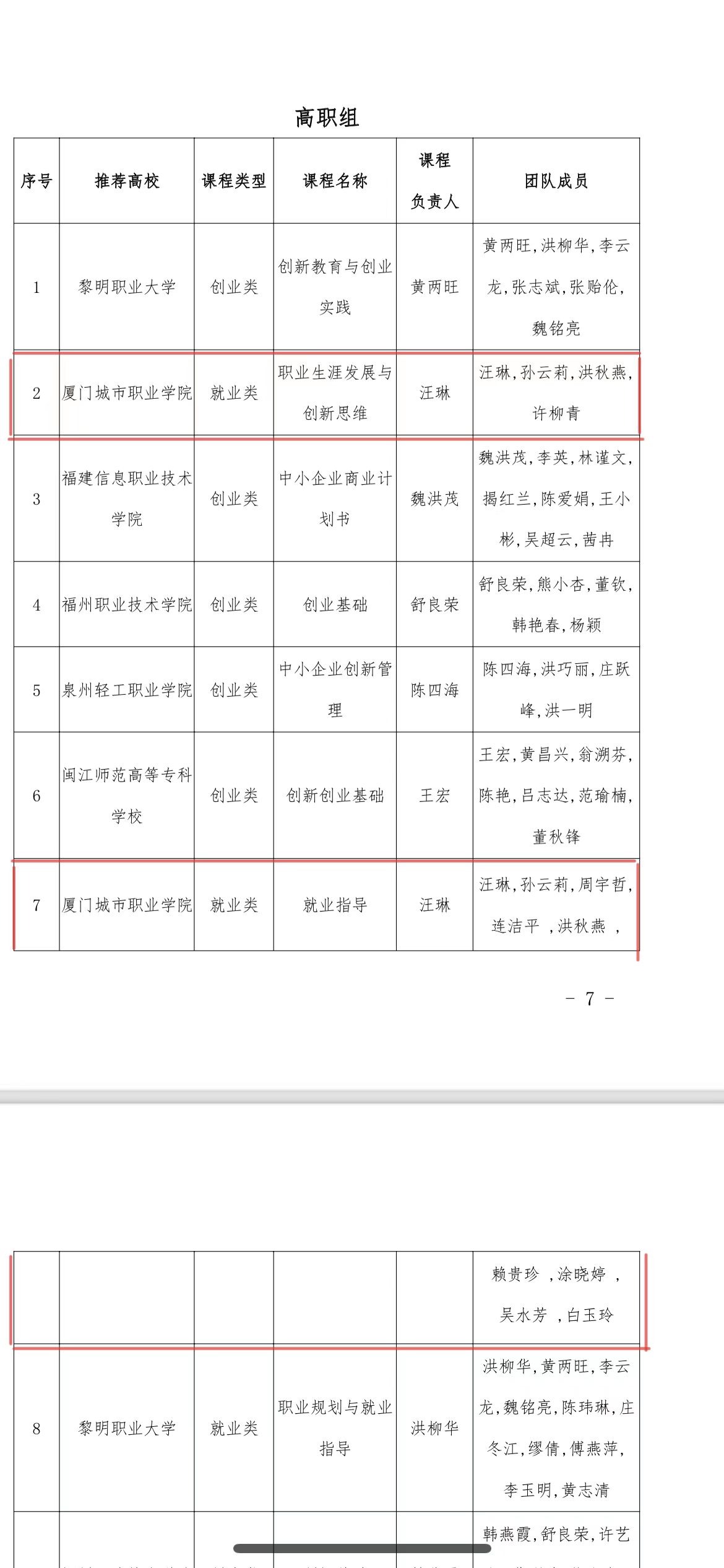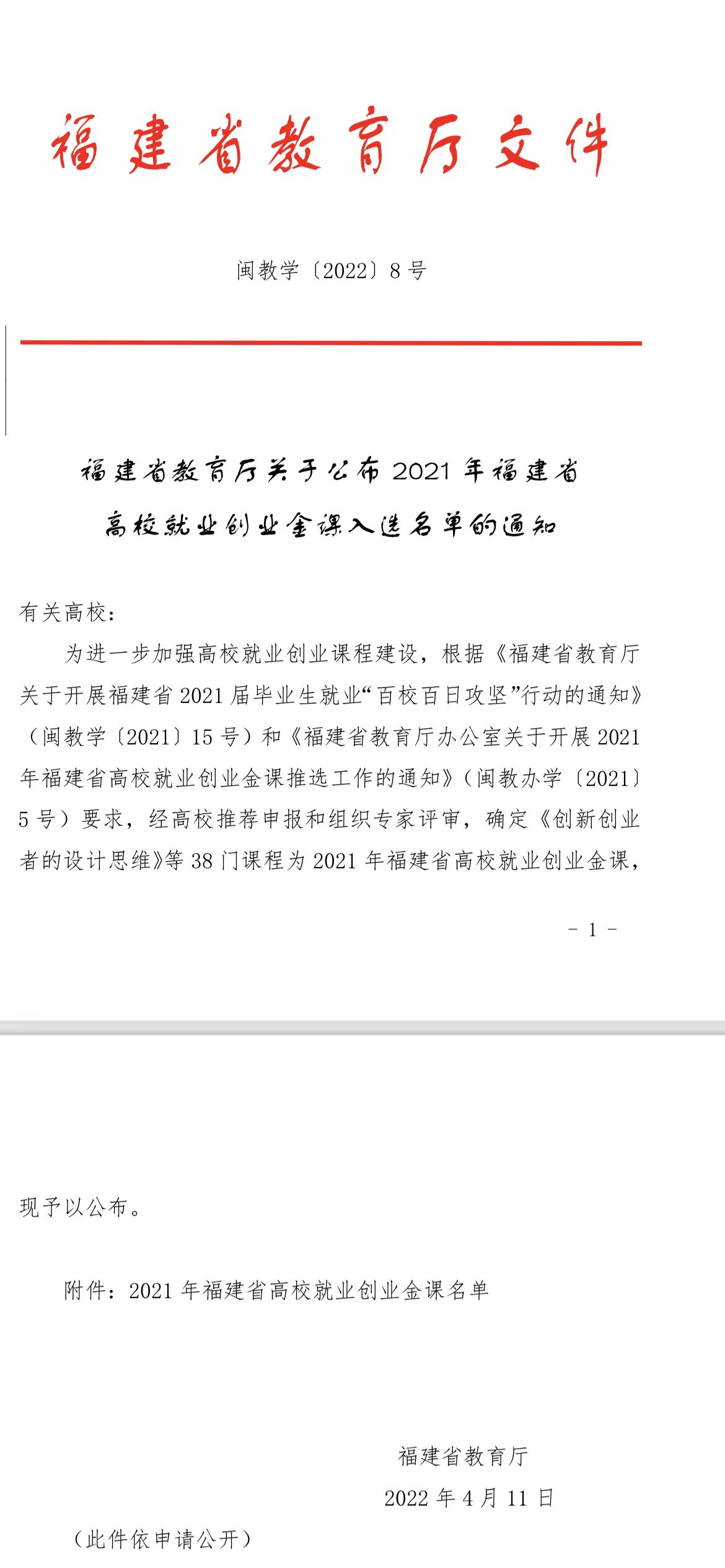 4月11日,福建省教育厅发布了“2021年福建高校就业创业金课入选名单”,我校《职业生涯发展与创新思维》(负责人:汪琳)和《就业指导》(负责人:汪琳)2门课程入选。