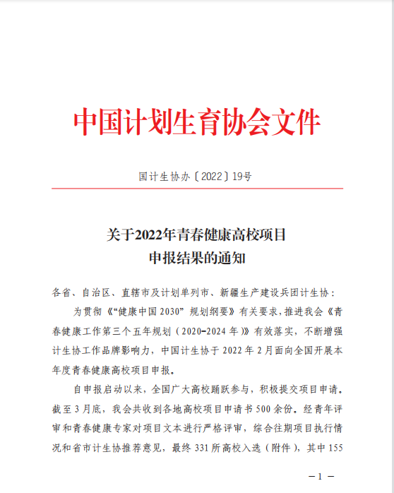 近日,中国计生协会公布了2022年度全国青春健康高校项目申报结果,我校《青春同伴,健康同行》(项目负责人:朱银燕)成功入选为A类项目。据悉,今年全国共有500余所高校申报,经评审最终确定331所,其中155所列为A类项目高校。此次为我校首次申报此类项目。