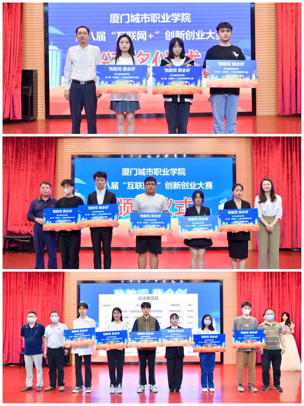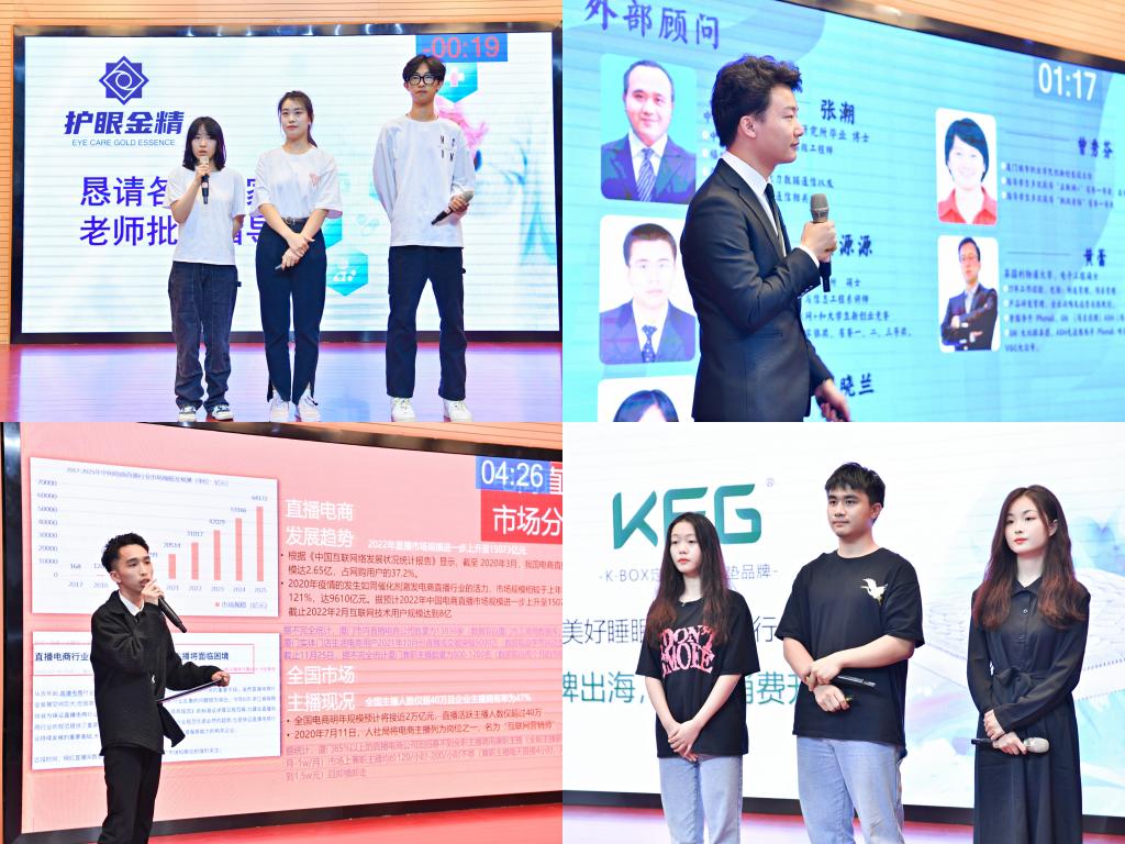 “互联网+”校级总决赛分为项目路演和答辩两个环节。各参赛团队从市场痛点、解决方案、核心技术、商业模式、营销策略、财务分析、发展战略等方面展开路演,评委围绕着创新维度、教育维度、商业维度、团队维度、公益维度、社会价值维度等方面进行提问和评审。最终,《护眼金精》《KFG盒子床垫》《弘魂文化》等3个项目获得本次大赛金奖,《烯导科技》《智绘小城》《星启时代》《千里传音》《鲜小盒》等5个项目获得银奖。此外,《小番茄大未来》《至善书法》《捷清》《DZ·知遇》《安食达预制菜》《鹏程万里》等6个项目通过网络评审获得此次大赛铜奖。