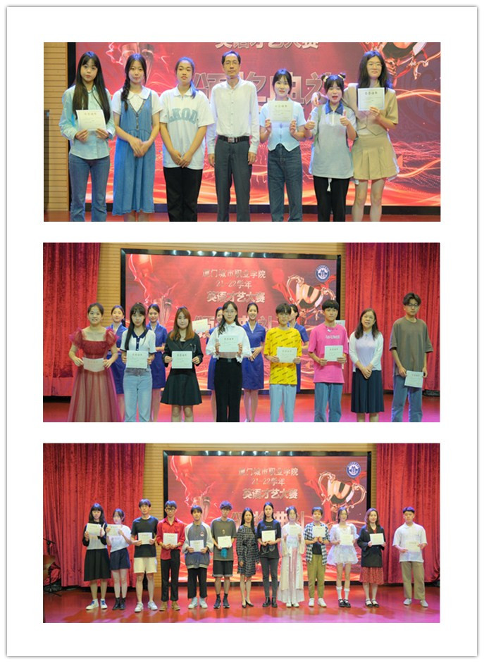 本次英语才艺大赛以英语为桥梁,以竞赛为平台,多个节目将中华优秀传统文化元素融入其中,充分发挥文化自信在展现英语才艺中的作用,展示了我校学子的青春风采,提升了学生“用英语讲好中国故事”的跨文化沟通能力和传播能力。比赛评委由国际旅游学院孙淑芬教授、通识教育学院公共英语教研室教师林韶蓉、陈涵琪、黄鹂、黄云燕以及商英20级学生阙语欣和陈佳妮担任。经过精彩角逐,来自康养21B的林诗茵、学前21D的陈姝、卓琳、向荣、阙文迪、物联网21B的郑都格从24个节目中脱颖而出,分获语言类、表演类、歌曲类一等奖。通识教育学院的郑莉凡老师作为表演嘉宾上台献唱了中国民歌《越人歌》。
