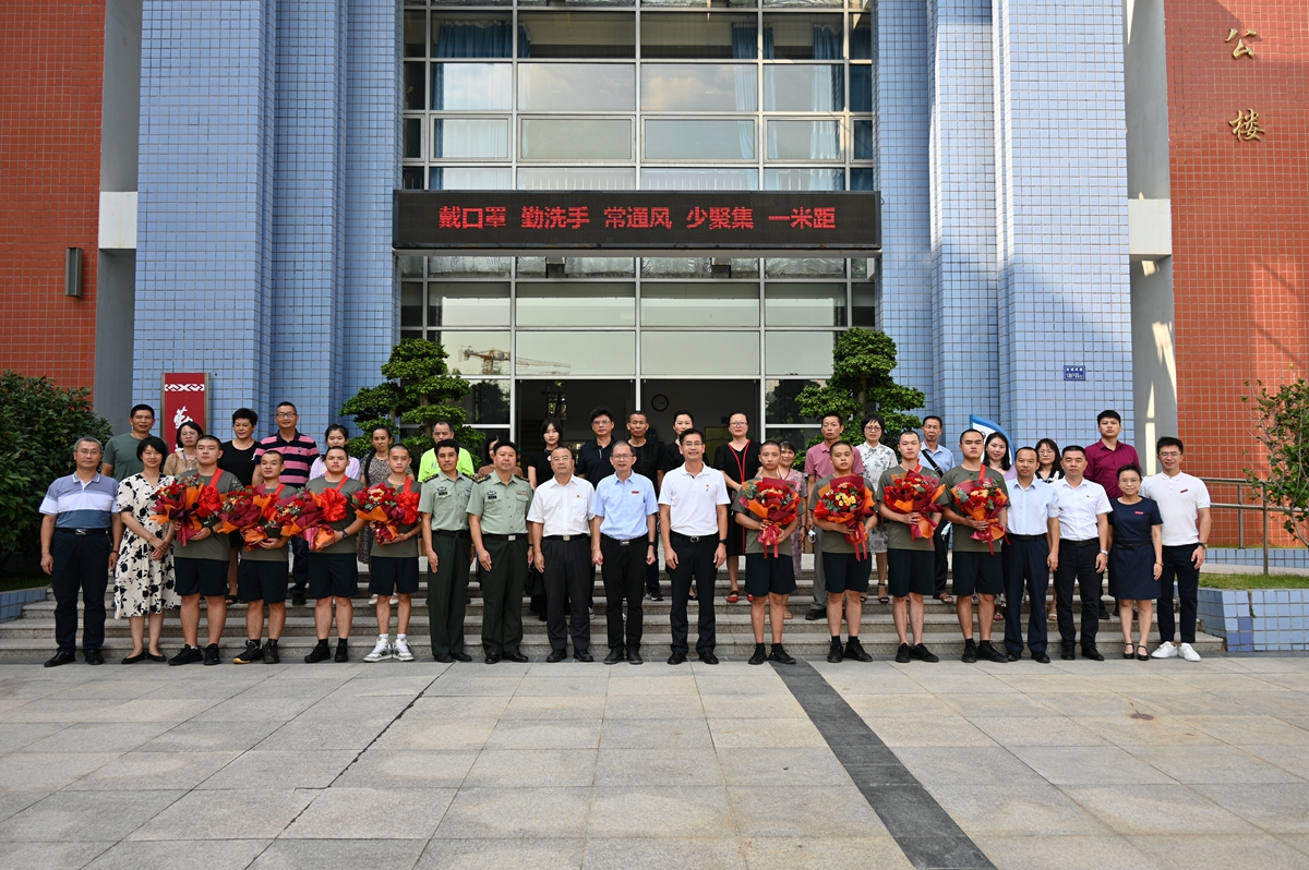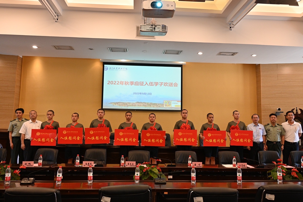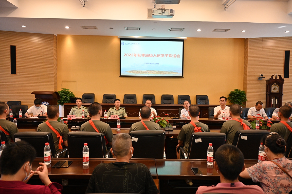 9月13日下午,我校2022年秋季应征入伍学生欢送会在会议二举行。今年秋季,我校共有8名学生应征参军入伍。校党委书记蒋先立,校长唐宁,校党委副书记王育培,思明区委常委、人武部部长孙燕杰,区人武部政委刘旭,学校学工、教务、保卫等职能部门负责人和各二级学院党总支书记、辅导员代表、入伍青年和家长代表参加了欢送会。
