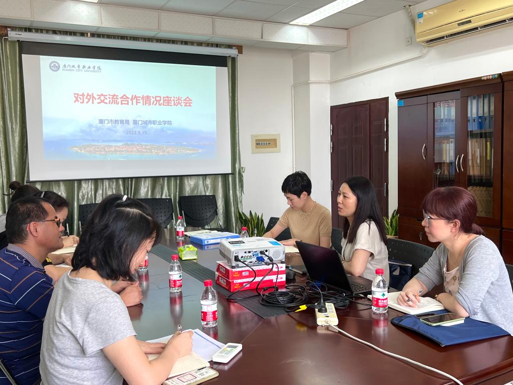 9月19日,厦门市教育局国际合作与交流处徐菁处长一行调研指导我校对外交流合作工作。我校副校长陈旭辉及产教融合促进处全体在校人员参加了调研座谈。