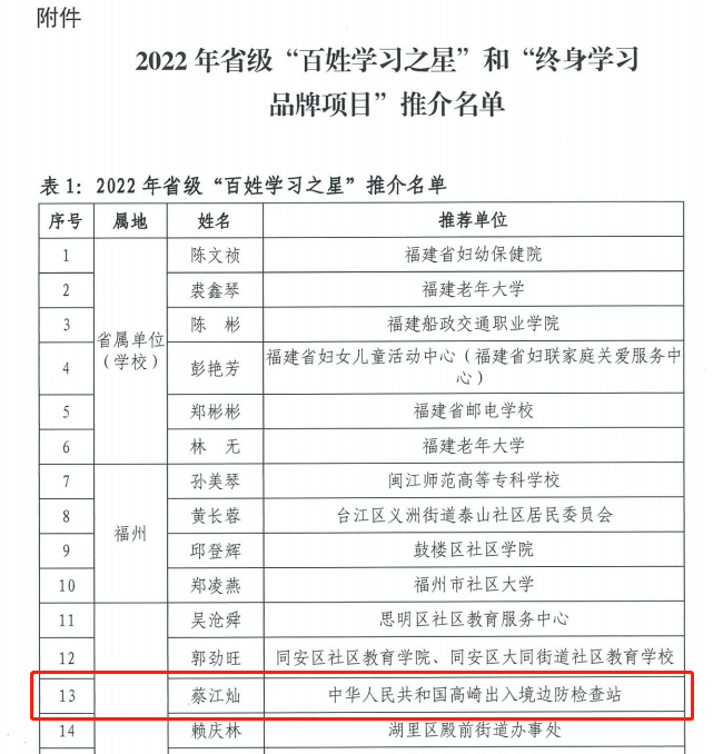 9月22日,2022年福建省“百姓学习之星”和“终身学习品牌项目”评选结果揭晓。我校选送的蔡江灿入选福建省“百姓学习之星”推介名单,“‘政-校-社’多元主体终身教育服务共同体探索与实践”入选福建省“终身学习品牌项目”推荐名单。