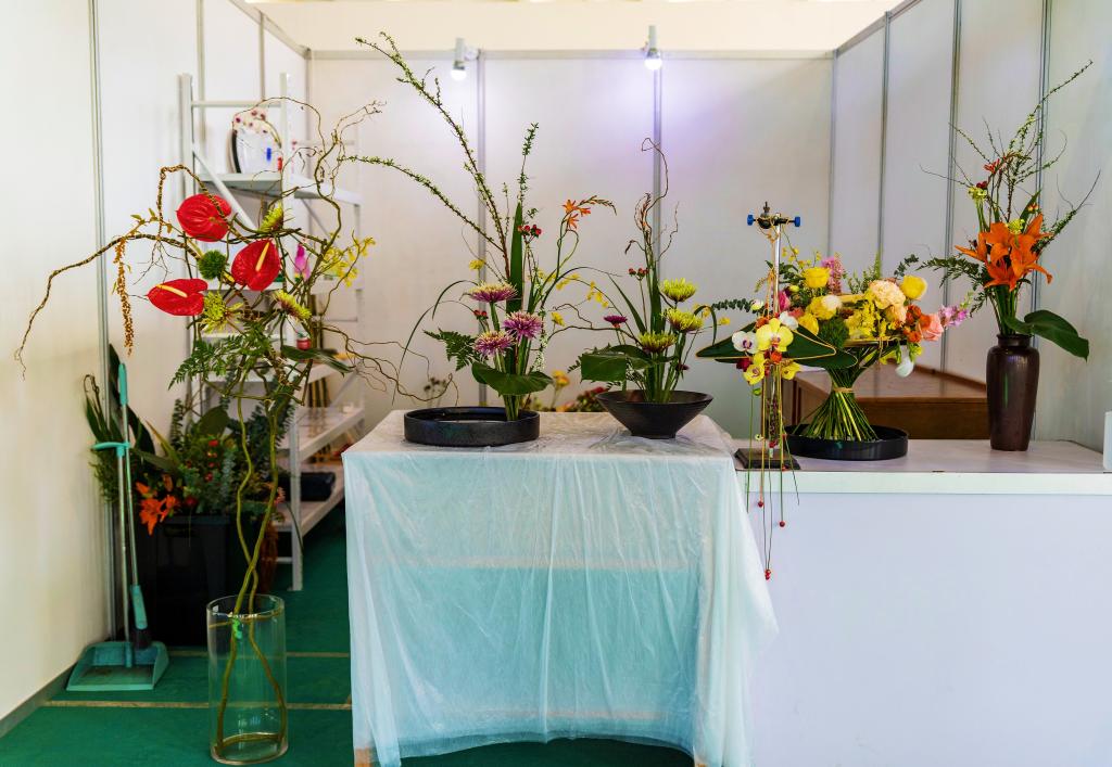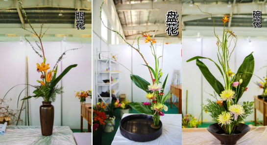 参赛选手的中国传统插花作品——瓶花、盘花和碗花