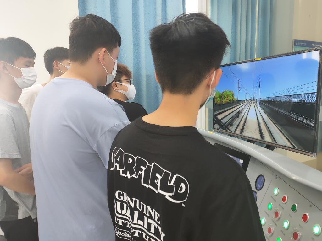 在校内轨道交通科普教育与职业体验基地指导参观者学习体验