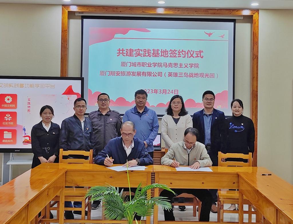 3月24日下午,厦门城市职业学院(厦门开放大学)马克思主义学院与翔安旅游发展有限公司共建思想政治教育实践基地签约仪式在英雄三岛战地观光园举行,马克思主义学院和开放教育学院教师代表、学生理论社团指导老师和翔安旅游发展有限公司有关负责人参加了签约仪式。