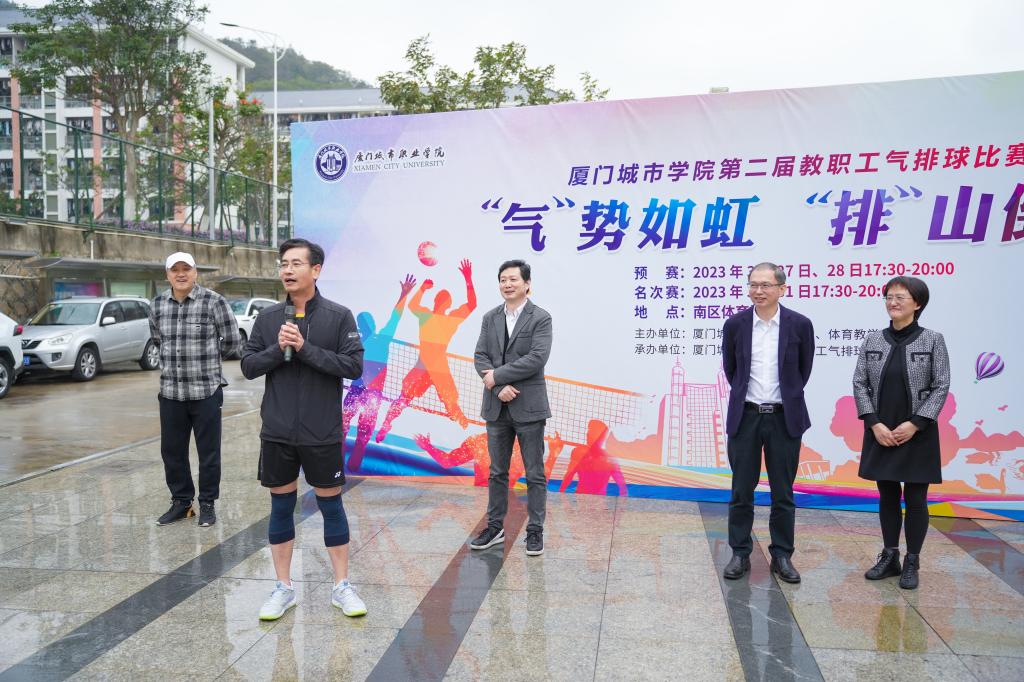 在3月27日的开幕式上,校长唐宁至现宣布比赛开幕,为比赛开球。党委副书记、工会主席王育培在致辞中说,该项赛事是工会、体育教研部以及教职工气排球俱乐部周密组织及精心安排,希望以此为契机,进一步增强广大教职工的体质,促进各二级学院工会之间交流,共同构建活力校园和健康城院。