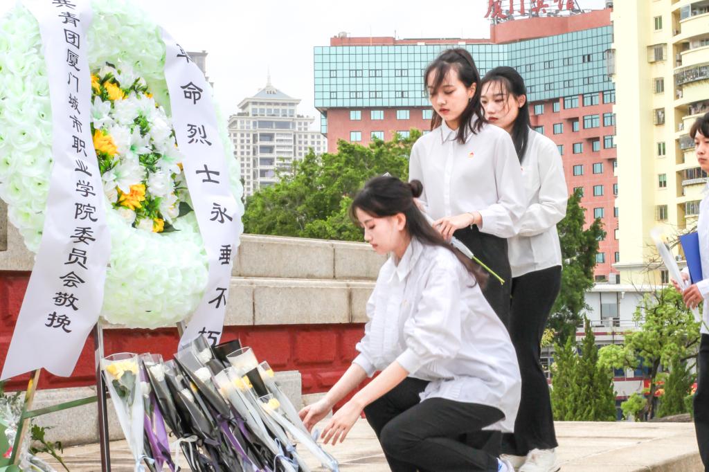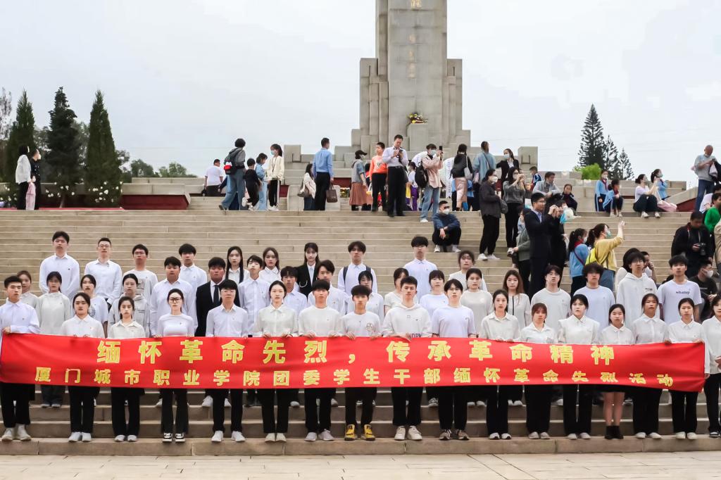 在烈士纪念碑前,全体人员整齐列队,肃立默哀,向解放厦门战役牺牲的1054位烈士致以最崇高的敬意和最深切的缅怀。全体师生面向革命烈士纪念碑鞠躬三次,依次敬献鲜花。历史是最好的教科书,师生们追寻着仁人志士与家国同行的足迹,在厦门革命烈士陵园纪念雕塑前,同学们面向团旗,以铿锵有力的声音,重温入团誓词。通过现场讲述巾帼女英雄张水锦的故事,朗诵诗歌《英雄》,深刻体会革命先辈们不怕牺牲、勇往直前的大无畏精神。