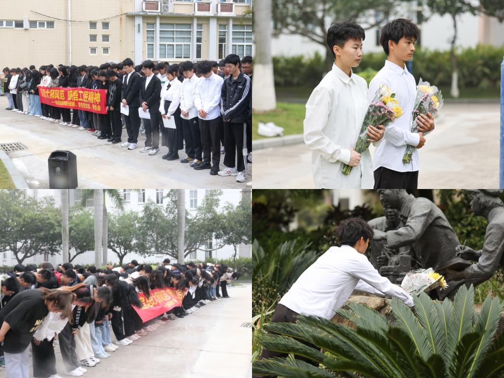 4月6日上午,智能制造学院在盖军衔群雕前隆重举行“最是精神动人心—深情缅怀杰出校友盖军衔”祭扫活动,智能制造学院师生代表近百人参加。大家重温了盖军衔的生平事迹,在我校原创歌曲《厦门天空明亮的星》的熟悉旋律中,学生代表向盖军衔雕像敬献鲜花,全体师生鞠躬,以此寄托对杰出校友盖军衔深深的敬意和无限的哀思。