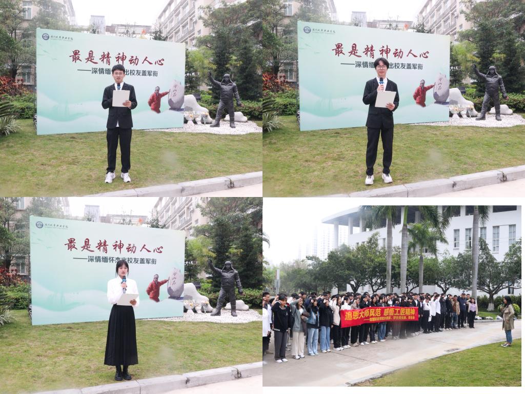 在盖军衔群雕前,2023年福建省职业院校技能大赛获奖者代表王圣博、许永翀,创新创业竞赛、成图大赛获奖者、盖式精英培养项目成员方妍作为学生代表结合自己的学习经历,分享了自己学习传承弘扬盖军衔精神的体会,辅导员王琰老师带领全体师生重温了盖军衔精神“爱国奉献、敬业勤勉、追求卓越”的内涵和力量。