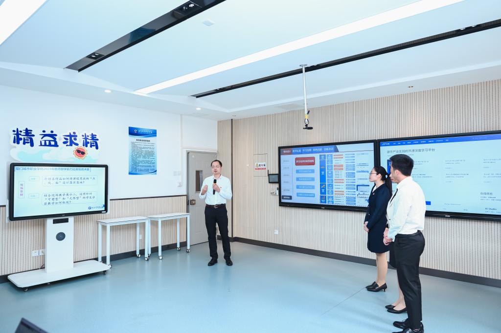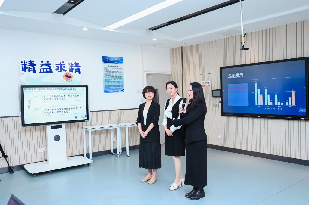 决赛采取“20+5”现场展示模式进行,即20分钟的教学实施报告介绍和两段无学生教学展示,以及5分钟的现场答辩。比赛过程中,各参赛团队精心设计,精彩展示,如《智能制造赋能中国式现代化全面推进中华民族伟大复兴》参赛团队展现了有情有义有温度的思政课教学模式,激发学生爱国热情;《音乐与戏曲鉴赏》参赛团队教师现场开展水袖示范教学。