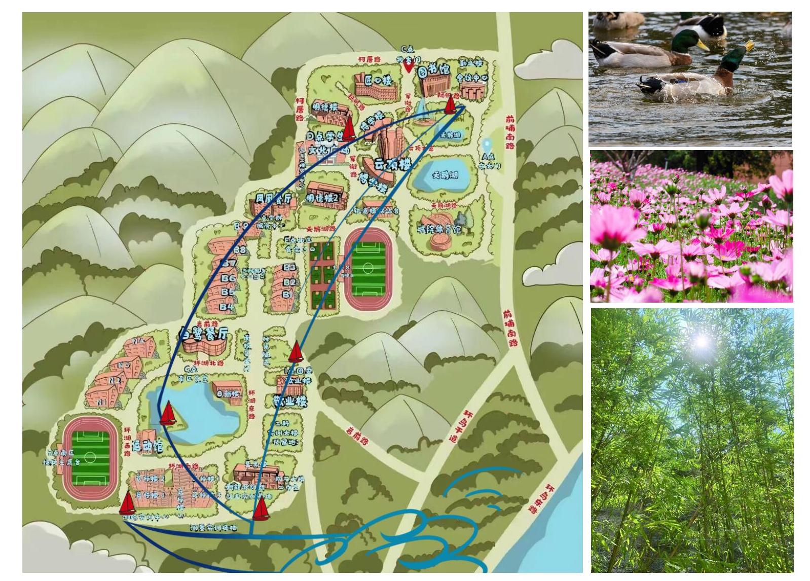 在春日暖阳中,北区勤业楼前端庄大方洒脱的花鹤翎正值花期,南区天鹅湖成群结队的绿头鸭正在湖面嬉戏,至善楼格桑花海开得极为热烈,笃行楼后山的绿竹林青翠茂盛……今年的踏青活动路线设计由北向南——从北校区以勤业楼和会议中心外围到匠心楼盖军衔群雕、城院站铁轨,再到南区停机坪、湖心岛、至善楼后坡和笃行楼后竹林,形成了校园春景六大打卡点。这六个打卡点连成一艘激流勇进的大帆船,寓意着城院“开放、协同、拼搏”大帆船精神,就像在启动仪式上王凯悦同学代表校红会倡议的,城院青年要积极行动起来,“放下手机,走出宿舍,革除不良的习惯;活跃于操场,活跃于校园,释放自我”。