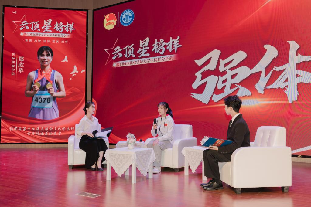 福建省第十七届运动会(大学生部)女子跳远第一名、国际旅游学院2021级郑欣苹同学,她分享了自己的艰苦训练、征战赛场、追逐梦想的精彩故事。运动技巧,她通过网上视频自学;运动反馈,请舍友拍摄视频帮忙;运动时长,不练到筋疲力尽不罢休。她建议同学们结合“晨点晨练”特色课程,合理调配时间,积极参加运动锻炼,更好应对压力,提升学习状态。