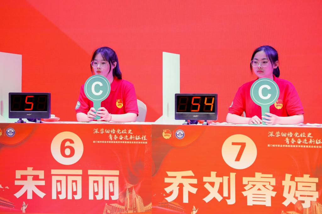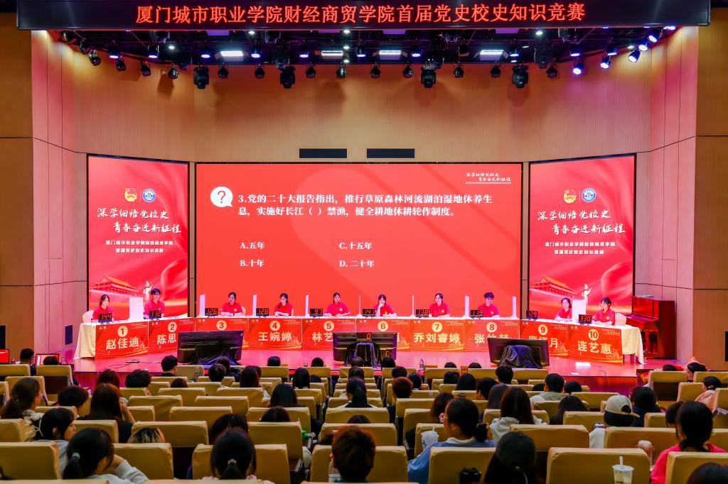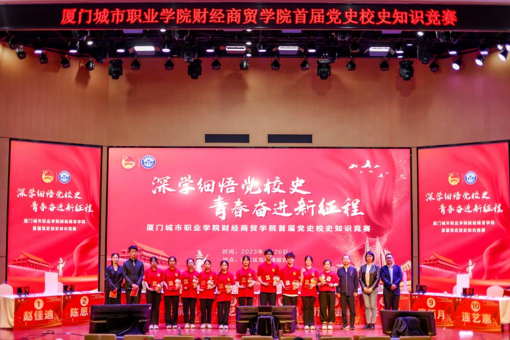 为进一步深化党的二十大精神进校园、进课堂、进头脑,进一步加强《厦门城市职业学院章程(2023年修订)》的学习宣传,4月26日下午,财经商贸学院首届党史校史知识竞赛决赛在笃行楼报告厅顺利举行。学生工作处负责人、财经商贸学院党总支负责人、马克思主义学院教师代表、财经商贸学院辅导员和学生代表200余人一同观看比赛。