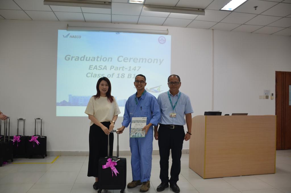 5月31日下午,我校与厦门太古飞机工程有限公司合作招收的EASA PART-147 B1.1第18班留学生毕业典礼在厦门太古培训中心举行。厦门太古技术培训部总经理陈卫强、我校产教融合促进处教师代表、飞机机电设备维修专业的留学生和家长们参加了毕业典礼。校企双方代表共同为留学生颁发了毕业证书。