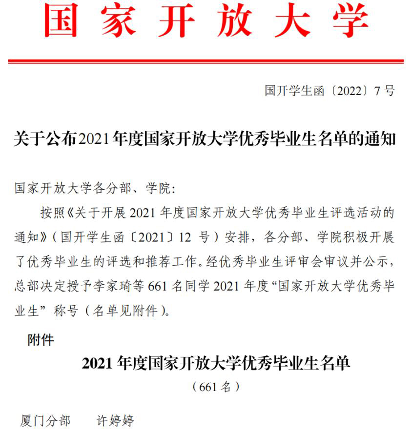 近日,国家开放大学公布2021年度优秀毕业生名单,我校思明教学点2019级工商管理本科许婷婷同学获评“国家开放大学优秀毕业生”称号。