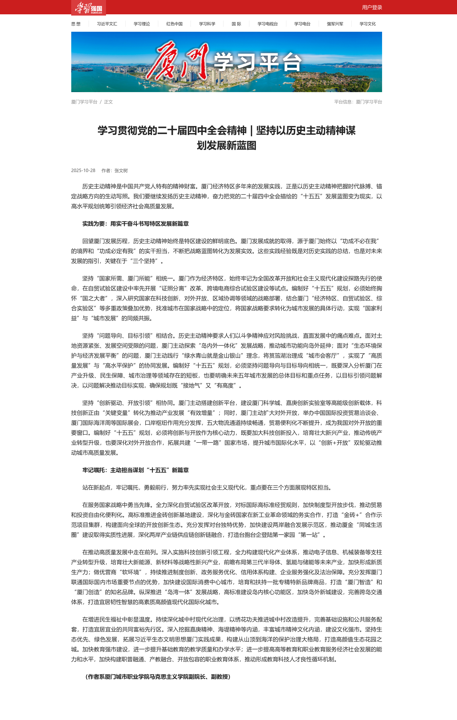 《学习强国》厦门学习平台刊发我校教师张文树理论文章《学习贯彻党的二十届四中全会精神——坚持以历史主动精神谋划发展新蓝图》,全文如下: