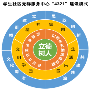 党支部创新“4321”党建新模式,即发挥4个功能(党建引领、思政创新、文化陶冶、共建共治),营造3个环境(精神家园、文明学园、生活乐园),实施2个抓手(打造多元治理新机制、构建师生成长共同体),聚焦立德树人这1个根本任务,充分发挥学生社区党性锻炼的熔炉作用;充分发扬师生党员勇于吃苦、敢于斗争的精神;充分发展朋辈互助、人人出彩的成长通道,使学生社区真正成为师生党员党性锻炼、教学相长的立体式育人空间。如下图所示: