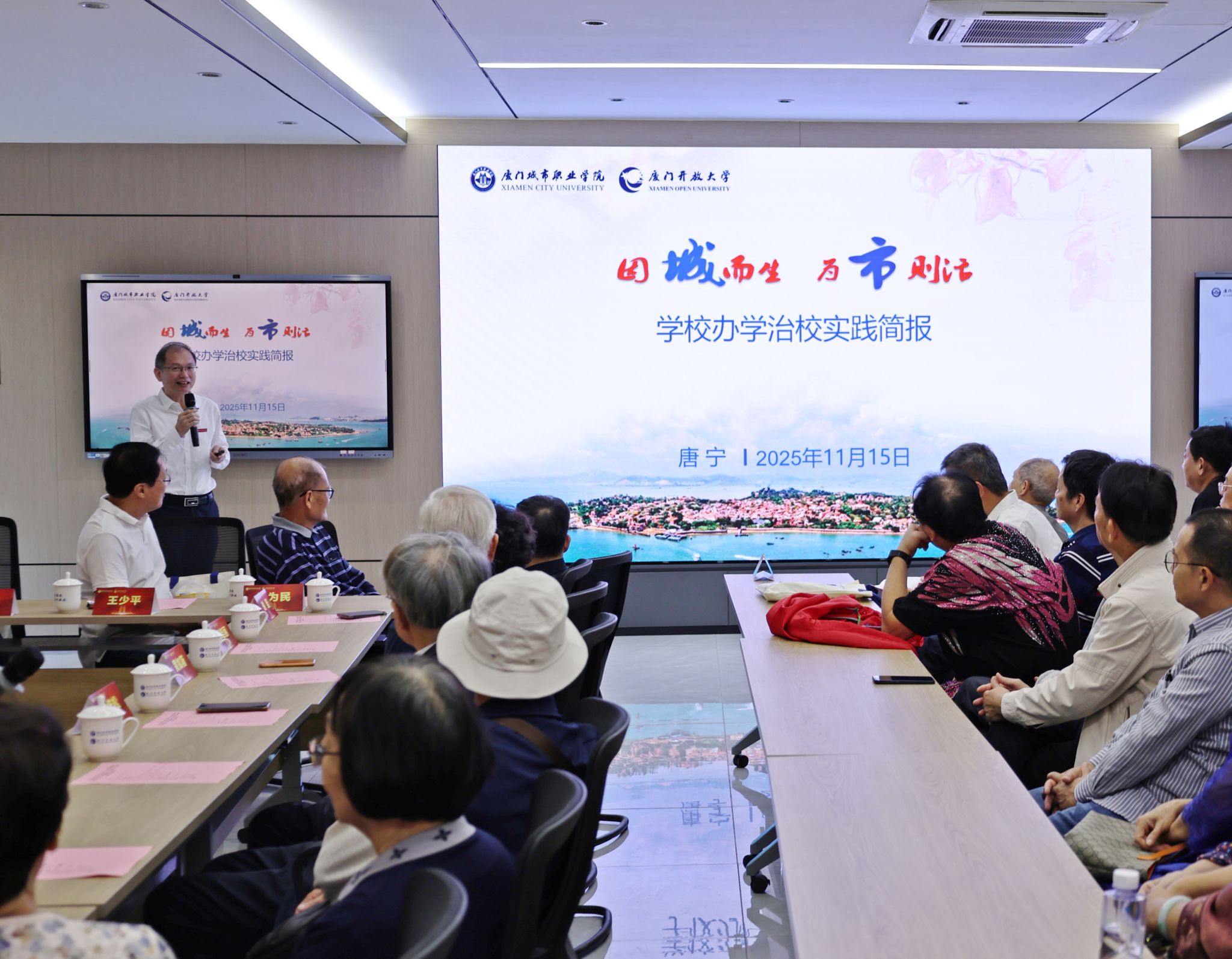 唐宁作《学校办学治校实践简报》报告,他从校史讲起,回顾了学校的发展历程,系统梳理了学校因应地方产业发展需求、调整优化专业布局、实施“大爱教育”等方面的创新实践,为校友们重点呈现学校秉持“因城而生、为市则活”的办学服务信念,创新构建产教融合机制,重塑立德树人生态等特色做法和成效,让校友全面深入了解学校当前发展态势。
