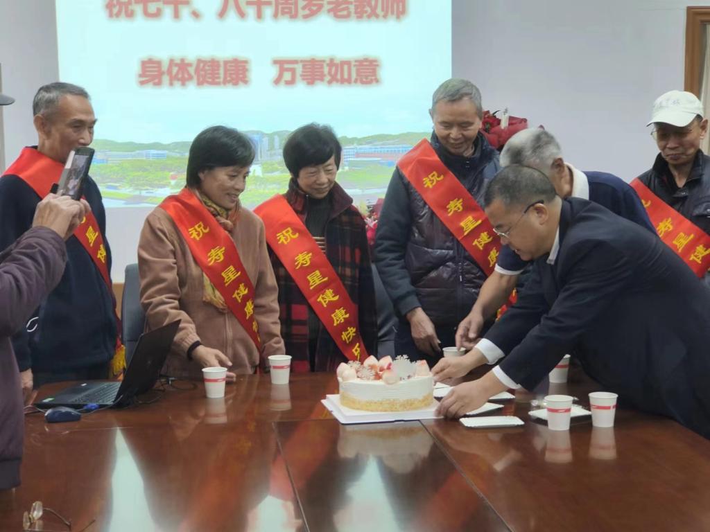 老教师们对蒋先立一行的到来表示感谢,对学校党政领导班子长期以来的关心关爱充满了感激,他们戴着写有寿星祝福的缎带,脸上洋溢着笑容,共同庆祝集体生日。